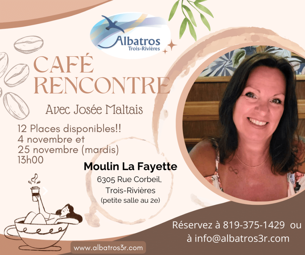 Deux belles rencontres de discussion avec les bénévoles animées par Josée Maltais au Moulin Lafayette. Quels seront les sujets ? Tous les sujets susceptibles d’intéresser les bénévoles dans l’accomplissement de leur accompagnement. Josée s’adaptera aux besoins du moment afin de mettre en place une discussion aidante à membres. C’est un rendez-vous ! Nous avons commencé l’an passé et les bénévoles en redemandaient.
