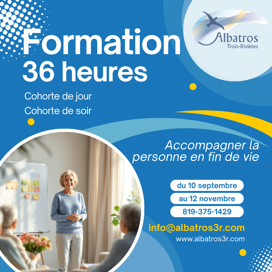 Début de la formation de 36 heures au 1800 rue St-Paul local 216 Trois-Rivières Cette formation est très populaire ! Faites vite pour réserver votre place ! Cette formation est un bon outil pour vous (accompagner vos proches) ou pour devenir bénévole et faire la différence pour un ou une malade.